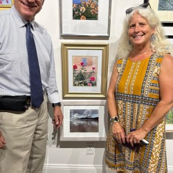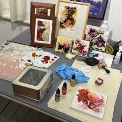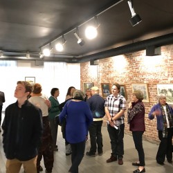 We have 26 pieces on display from 12 artists., with works in watercolors, ink on paper, acrylic monoprint, oil collage, metal flashing, gouache, hand stitched pieces, hand colored photography, mixed media and more.