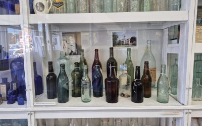 A display of local Ballston Spa history! This display shows bottles from local Ballston Spa pharmacies, dairies, sodas and spring waters. It also has the medical bag of Dr. Post, a prominent local physician.